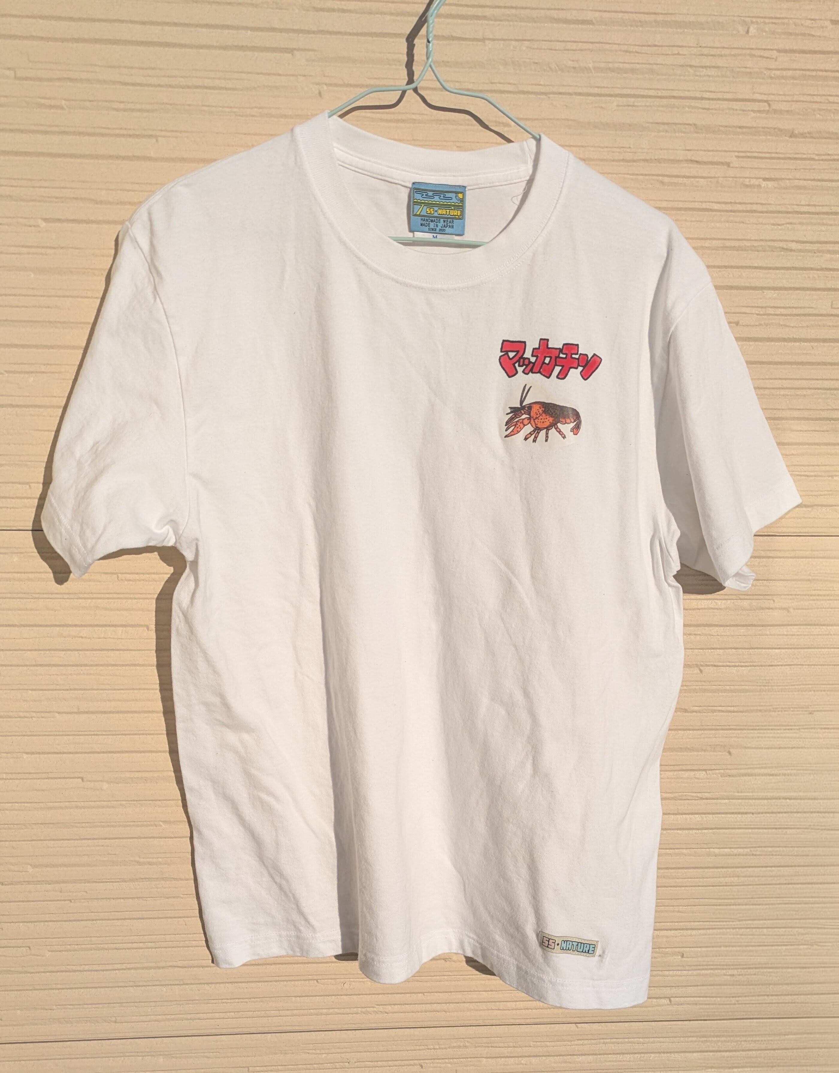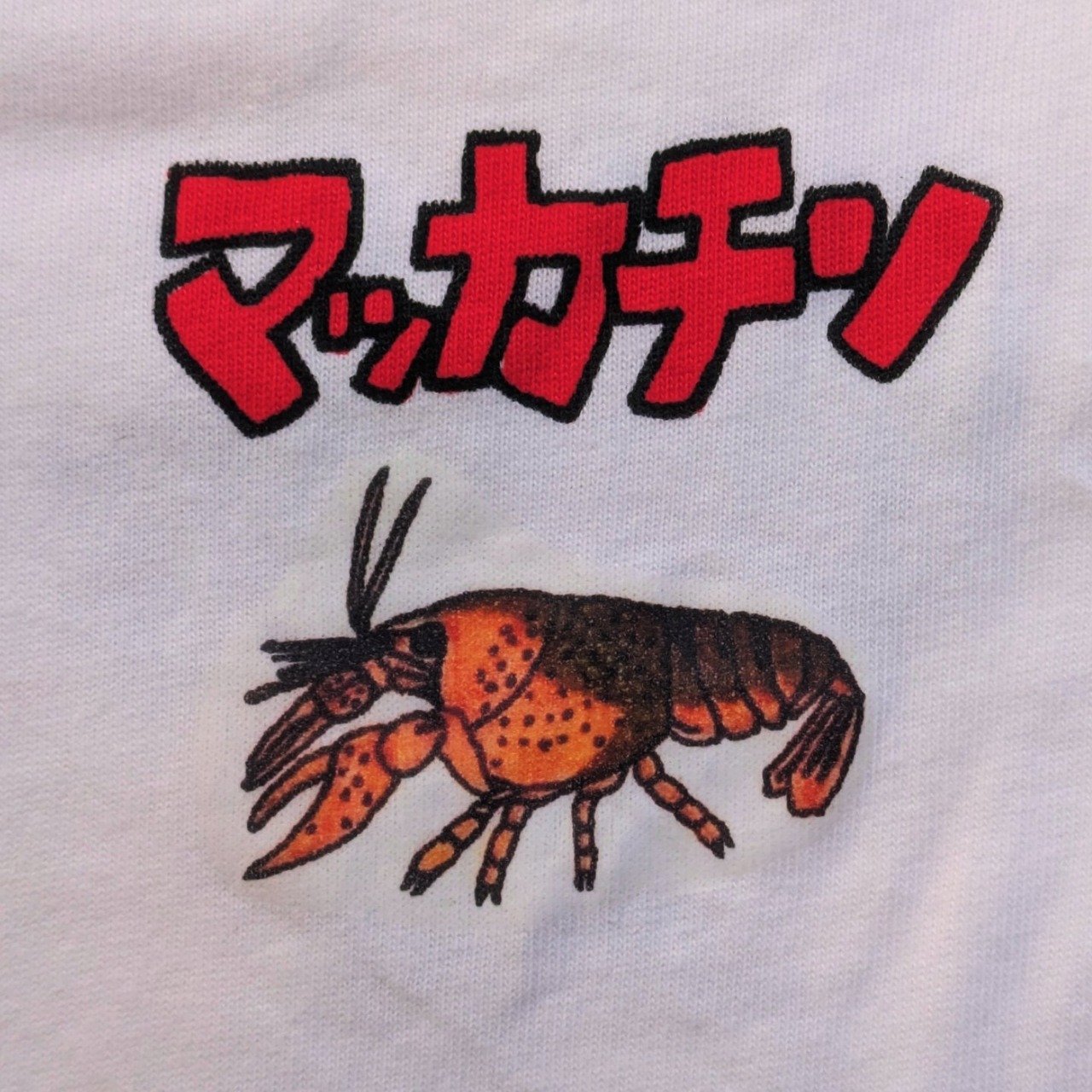 今回、このTシャツ作って初めて知った、衝撃的な事実があります!!「マッカチン」、、、全国共通のアメリカザリガニの呼び名だと思ってました。でも、何とこれ、埼玉で昭和時代に子供たちに呼ばれていた方言だったみたい!?この条件にドンピシャで当てはまっている、うんこうじにとっては、まわりの友達もみんなマッカチンって呼んでたし、大人になってからも全国で通じる呼び名だと思ってましたぁ!!つまり、ちょーニッチなTシャツの完成です!!でもアメリカザリガニはどこにでもいて、誰しも一度は関わった事があると思います。なんとなくレトロ感もあるし、気に入ってくれたなら、一着どーでしょー?