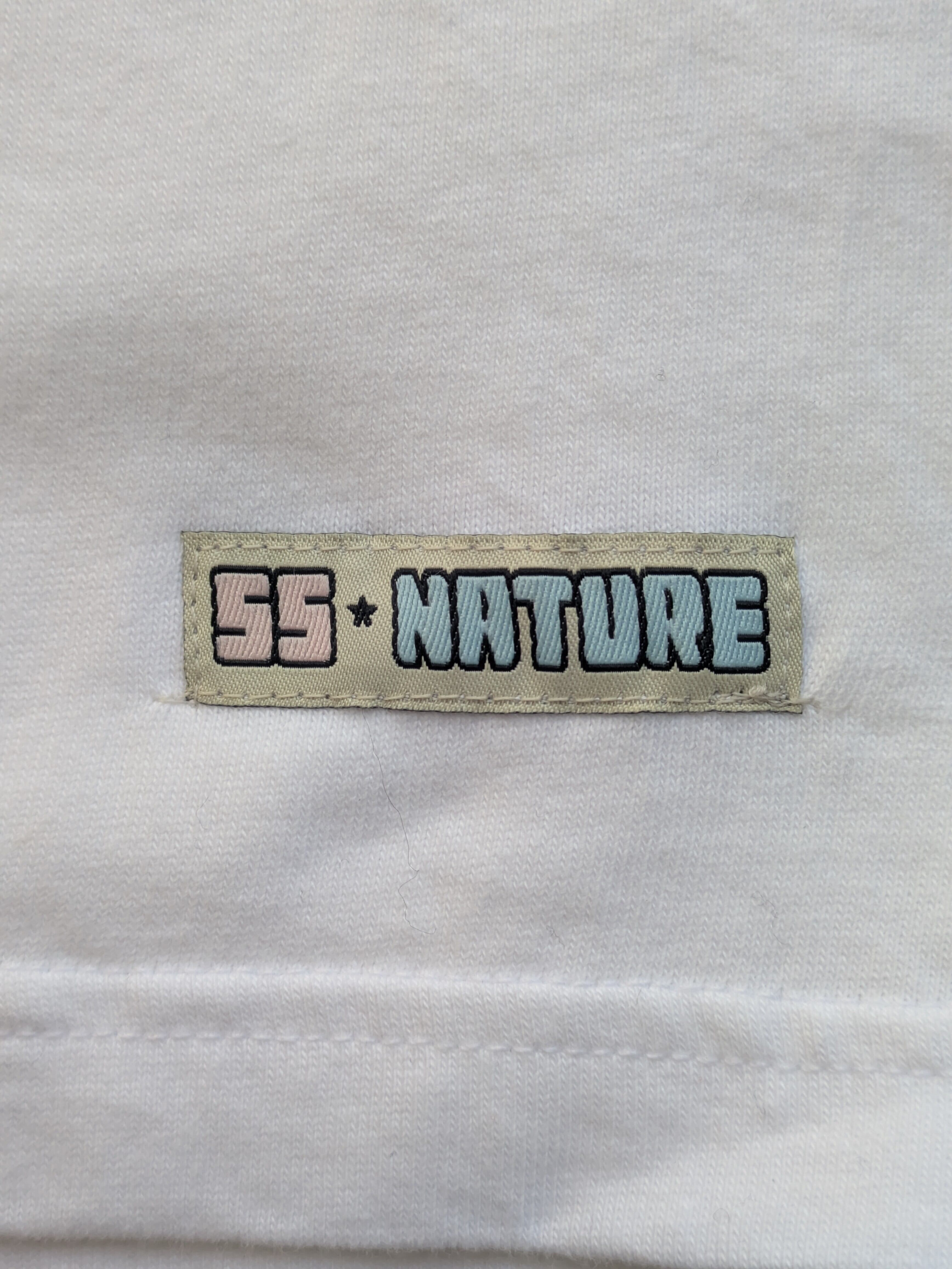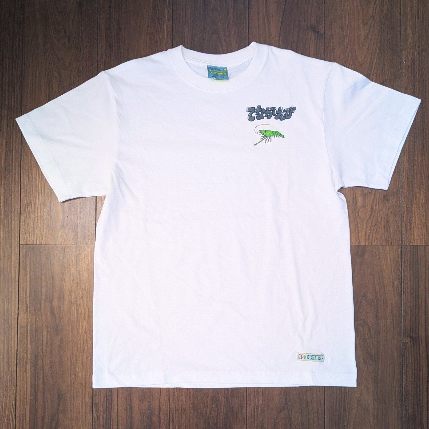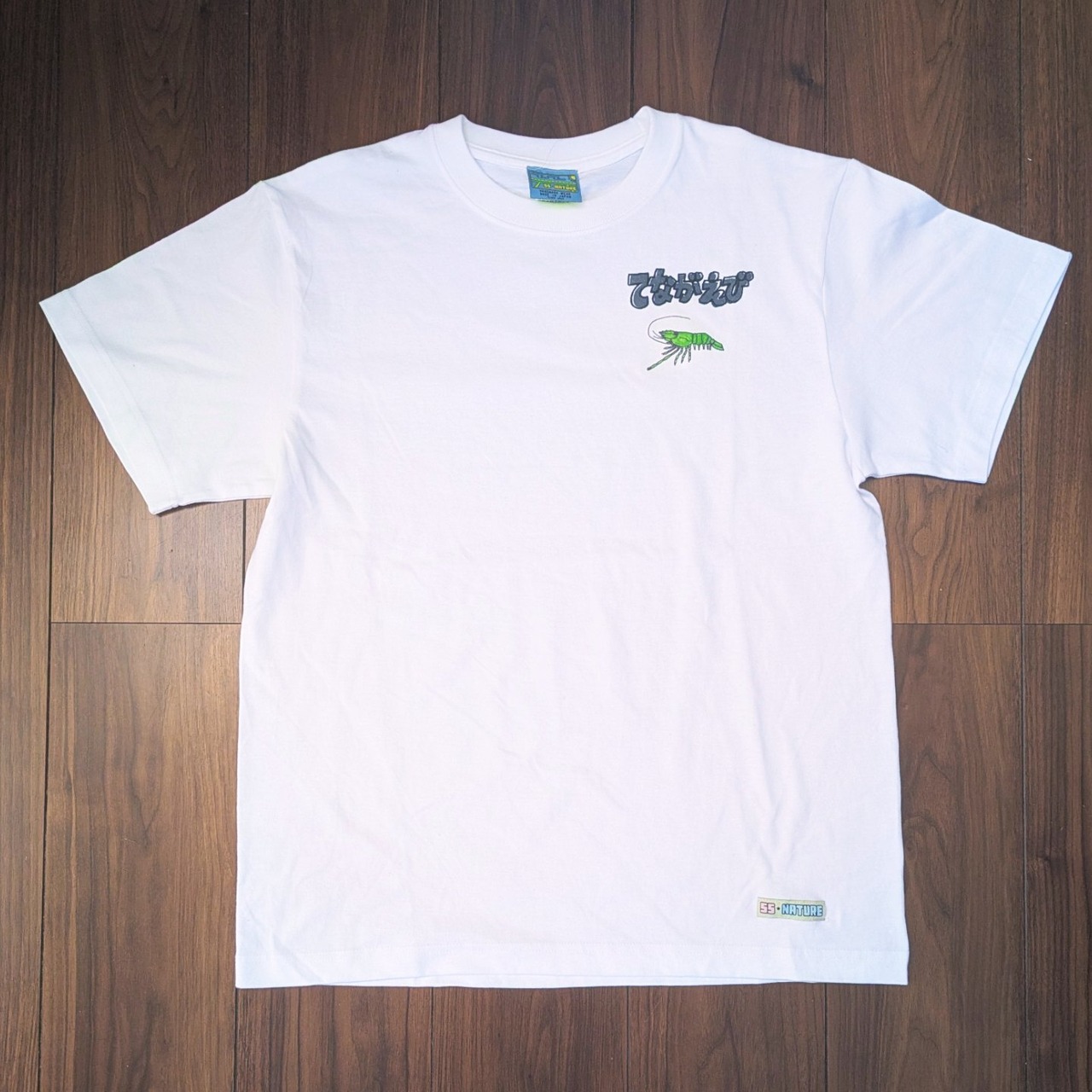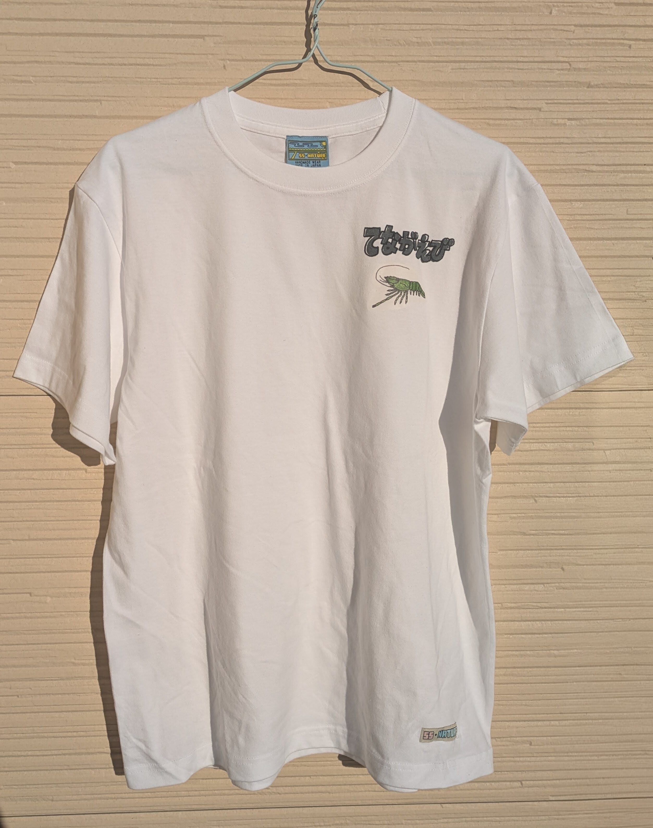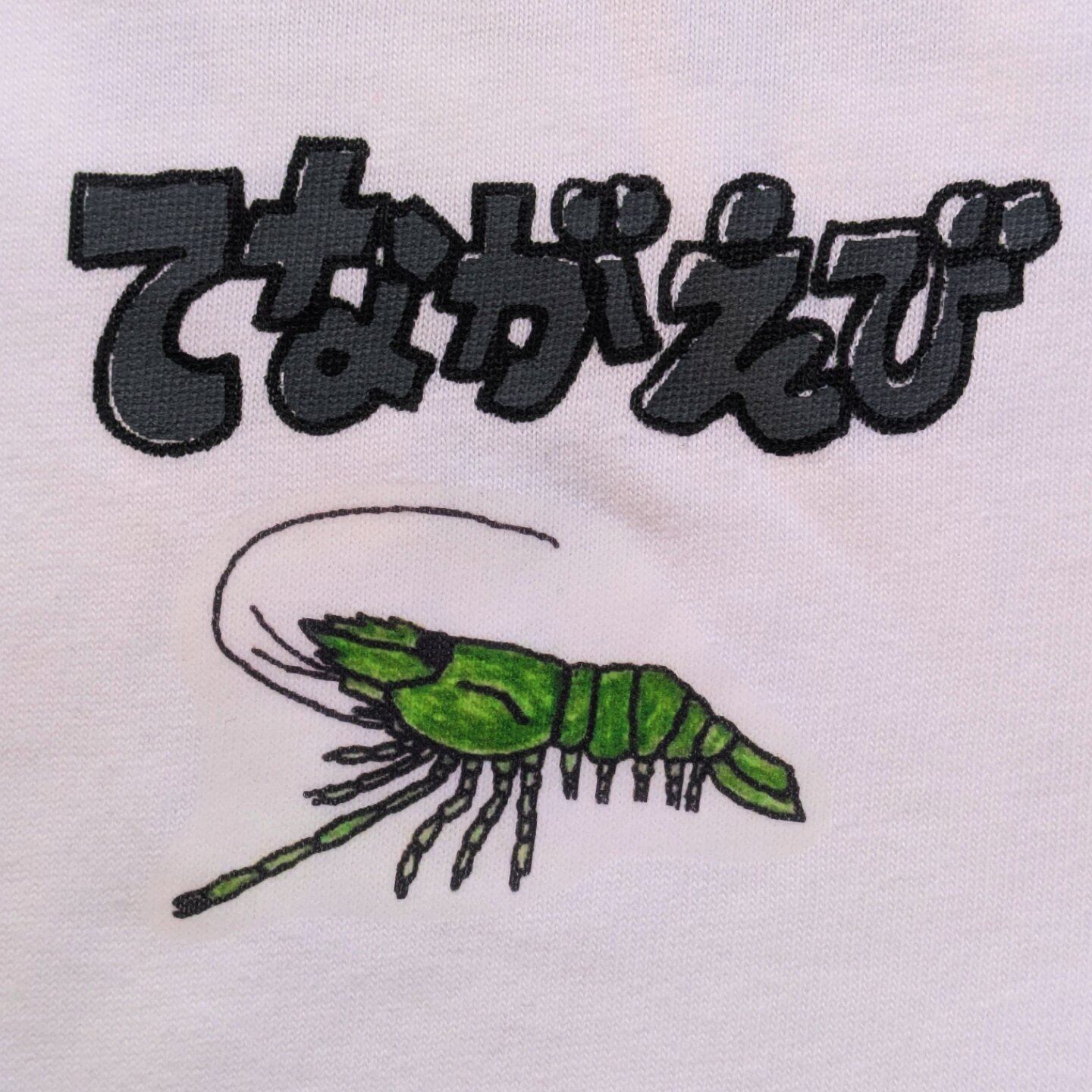 左胸ワンポイントの和名はシルクスクリーン2色刷り。自分が感じる魚のイメージを反映させたカラーです。その下にデフォルメ化した、てながえびのイラストをアイロンプリントで圧着。
