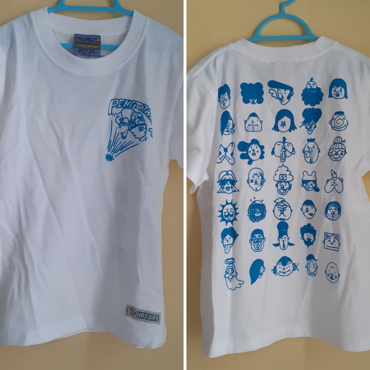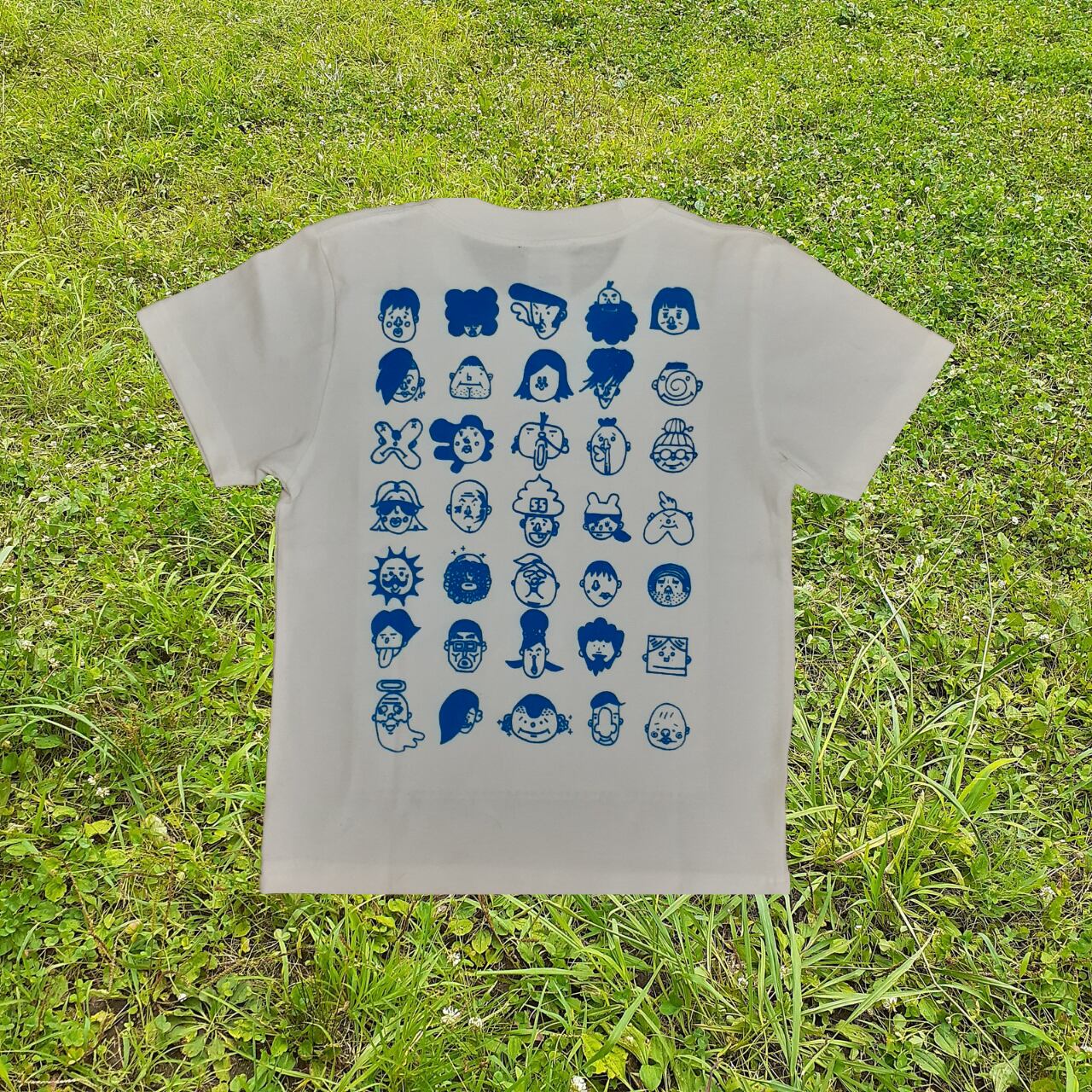 バックにたくさんの特徴的な顔をプリント。バックプリントはTシャツのサイズに合わせて、大人Tより縮小してプリントしてます。