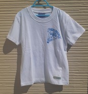 シルクスクリーンでの手刷りTシャツ 白地に空色インク。