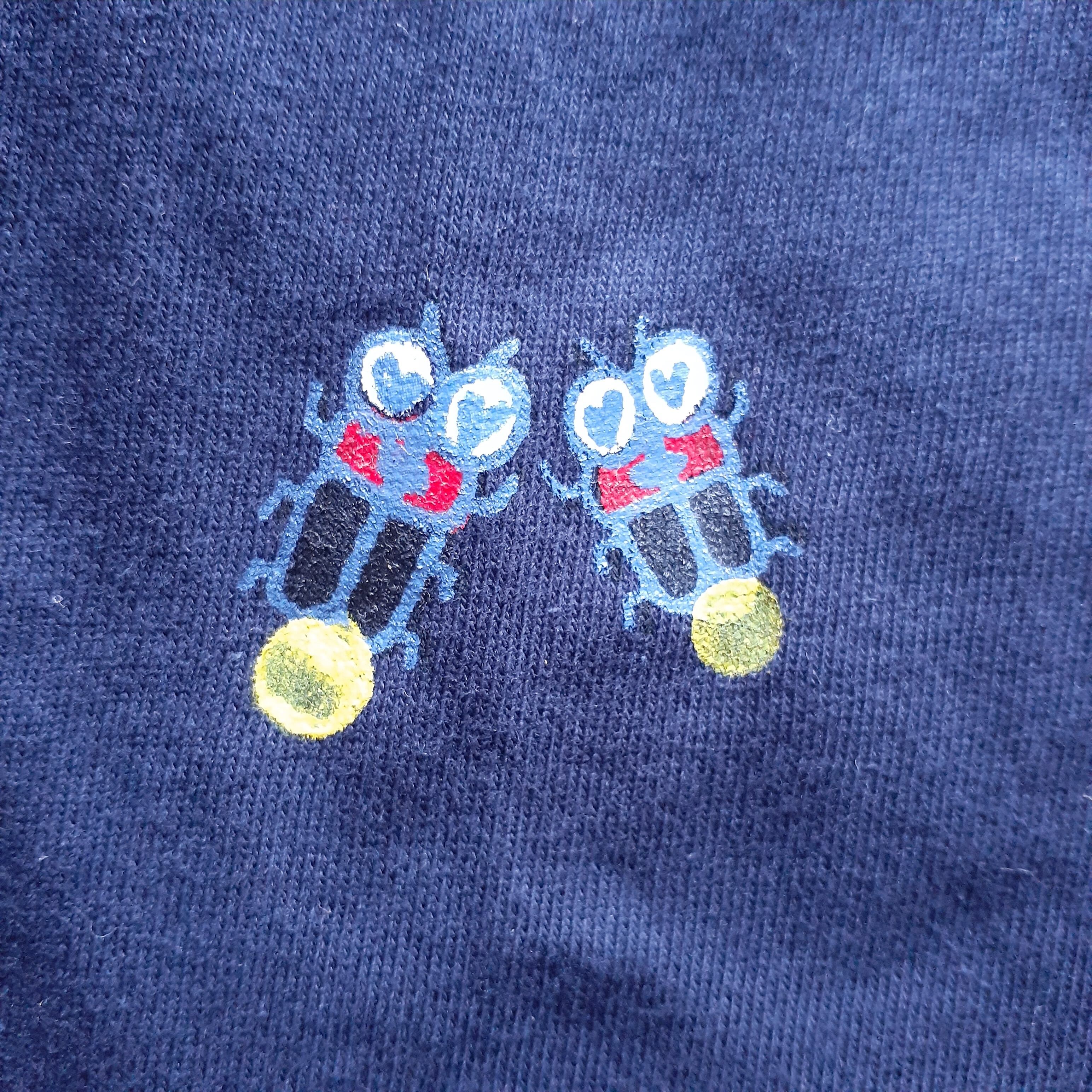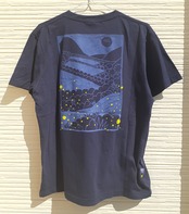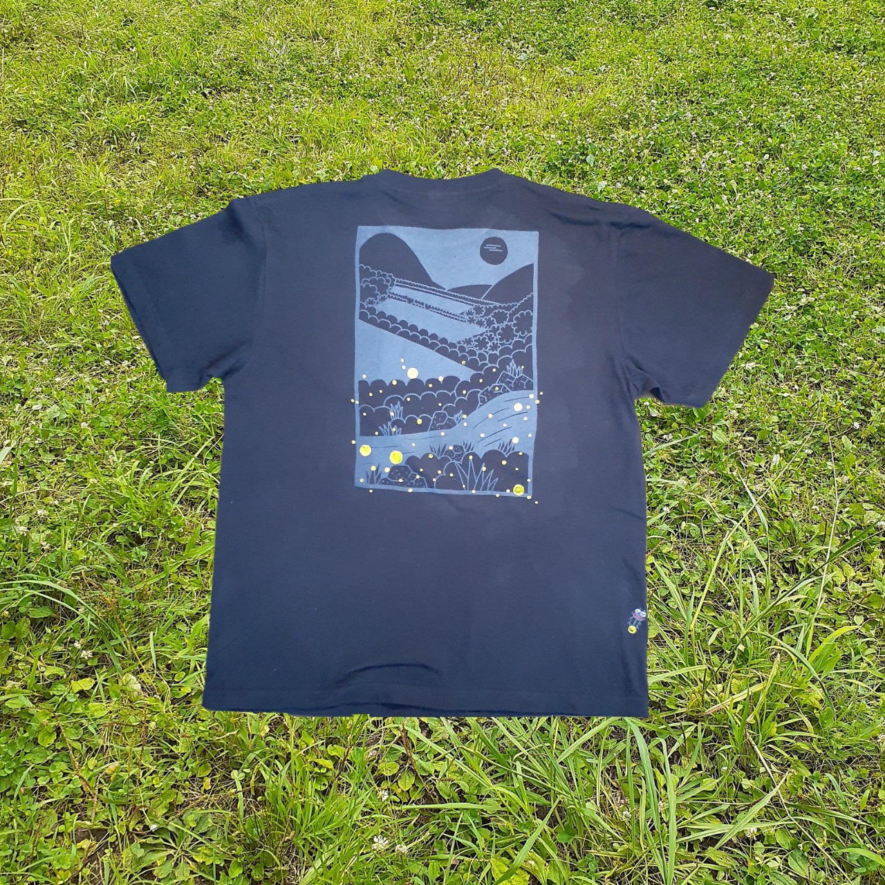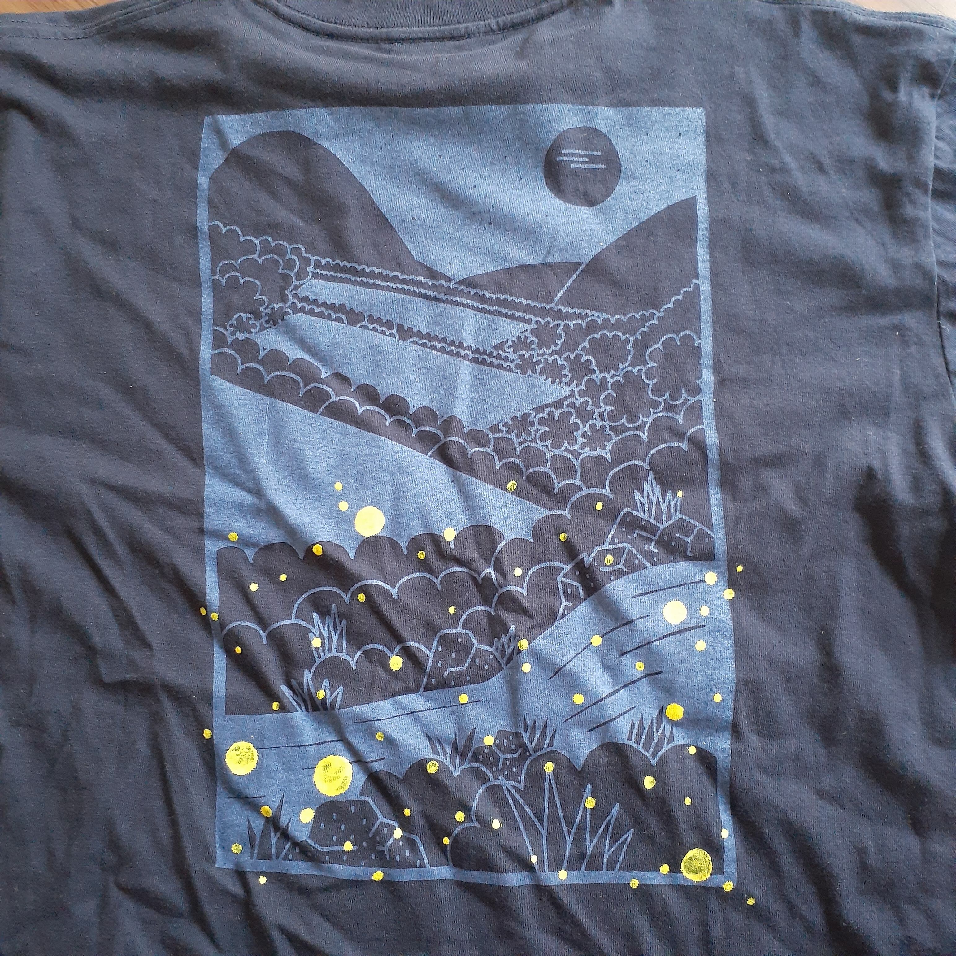 里山の風景は、夜だし目立たせたいのは蛍の光だから、ボディカラーのネイビーと近いインクでさりげなくプリント。その上に蛍の光。✴️