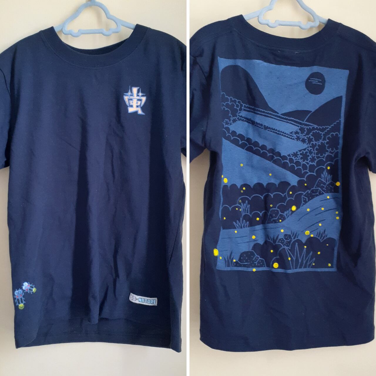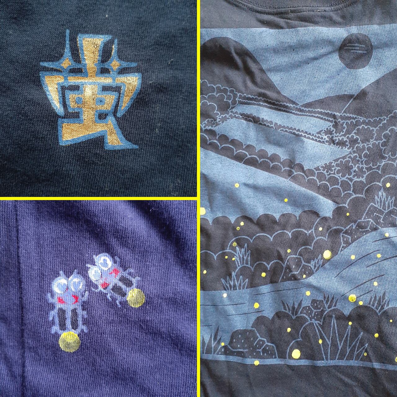 里山の風景は、夜だし目立たせたいのは蛍の光だから、ボディカラーのネイビーと近いインクでさりげなくプリント。その上に蛍の光。✴️