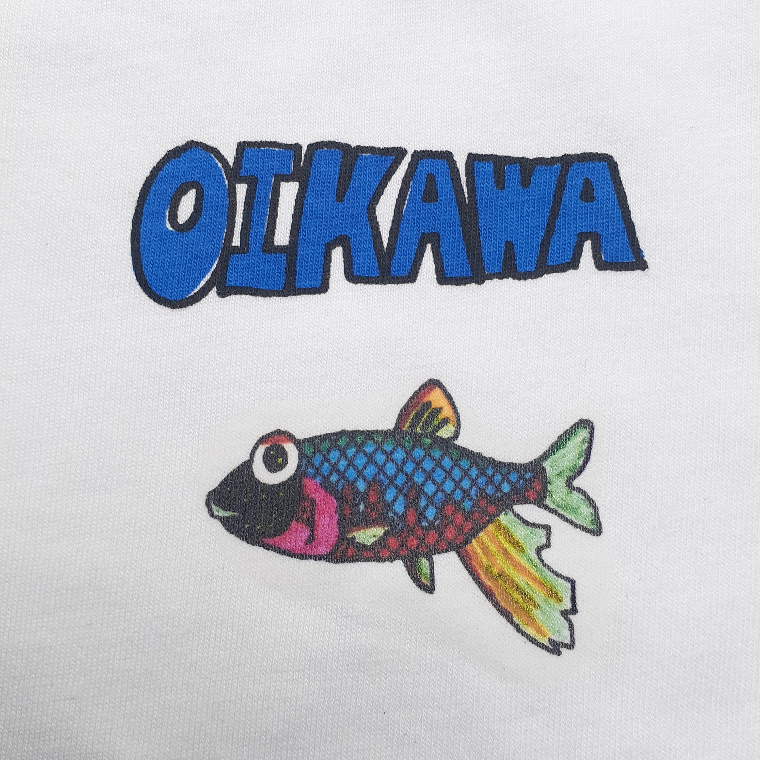 左胸ワンポイントの和名はシルクスクリーン2色刷り。自分が感じる魚のイメージを反映させたカラーです。その下にデフォルメ化した、おいかわのイラストをアイロンプリントで圧着。