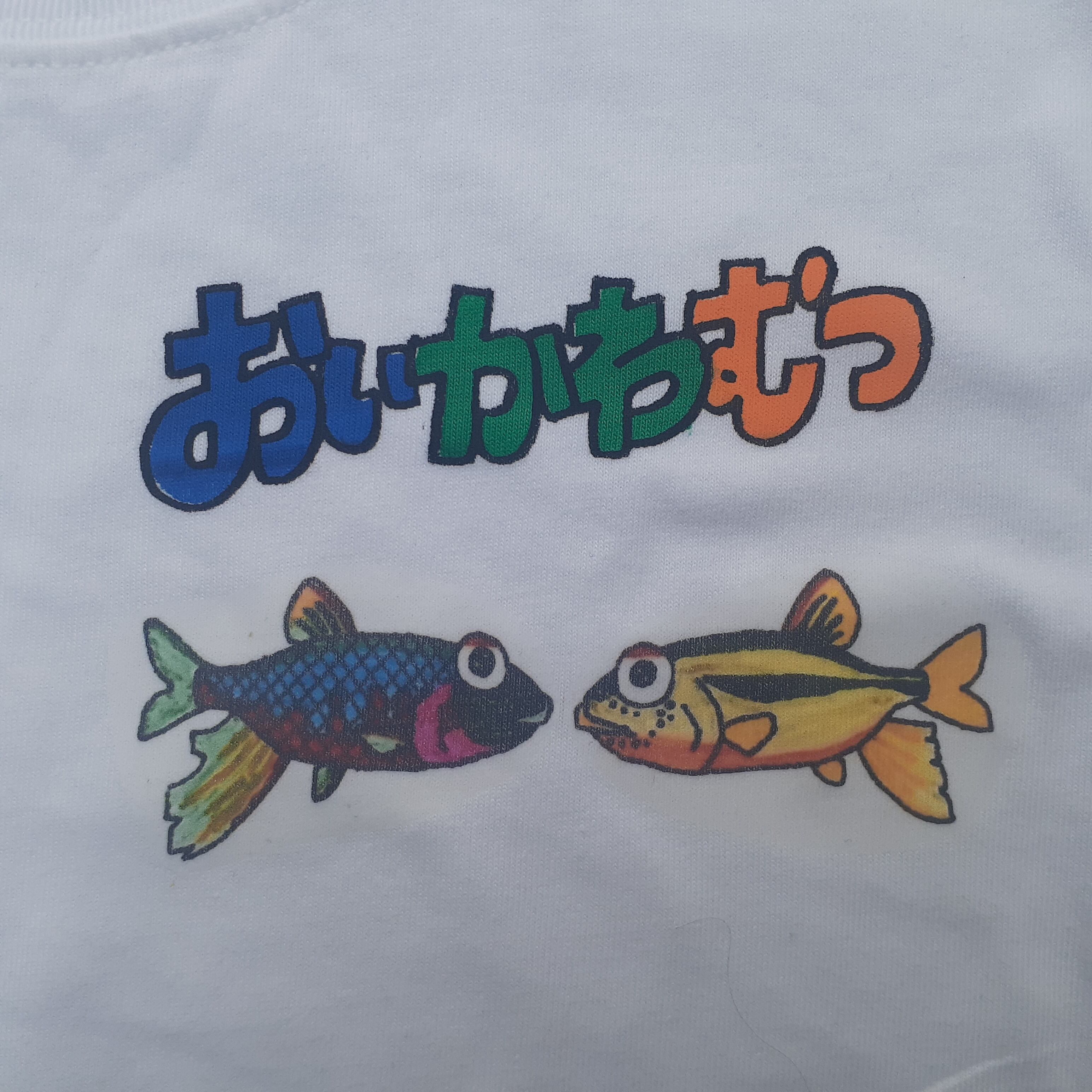 左胸ワンポイントの和名はシルクスクリーン4色刷り。おいかわのイメージカラー青とかわむつのイメージカラー橙、名前の被ってる部分、かわは中間色の緑にしました。その下にデフォルメ化した、おいかわとかわむつを向かい合わせ(仲良し)にして、アイロンプリントで圧着。
